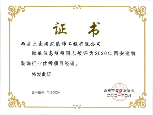 我公司資深項(xiàng)目經(jīng)理桂志平、高明明、張麥龍被評為2020年西安建筑裝飾行業(yè)優(yōu)秀項(xiàng)目經(jīng)理。